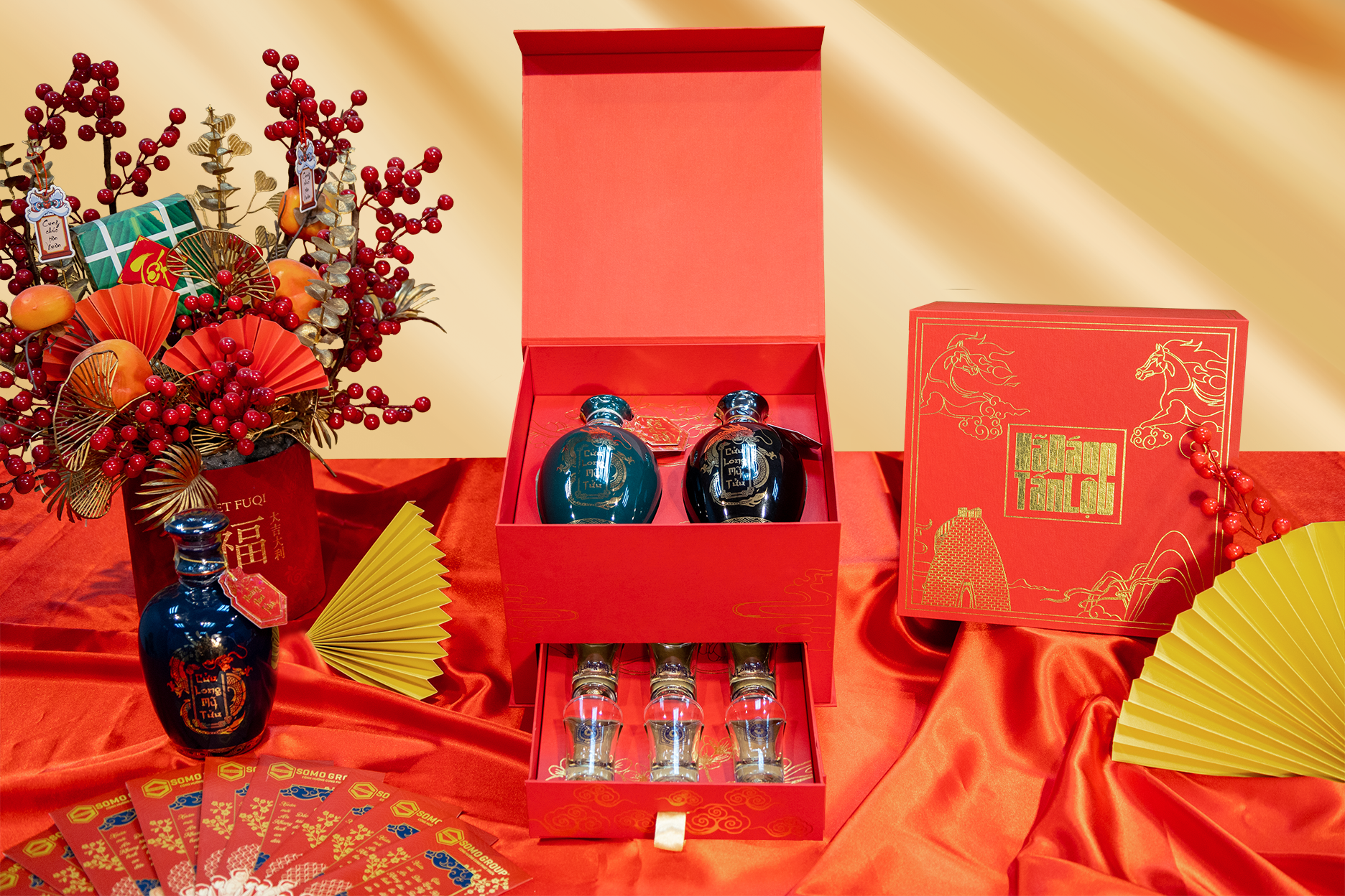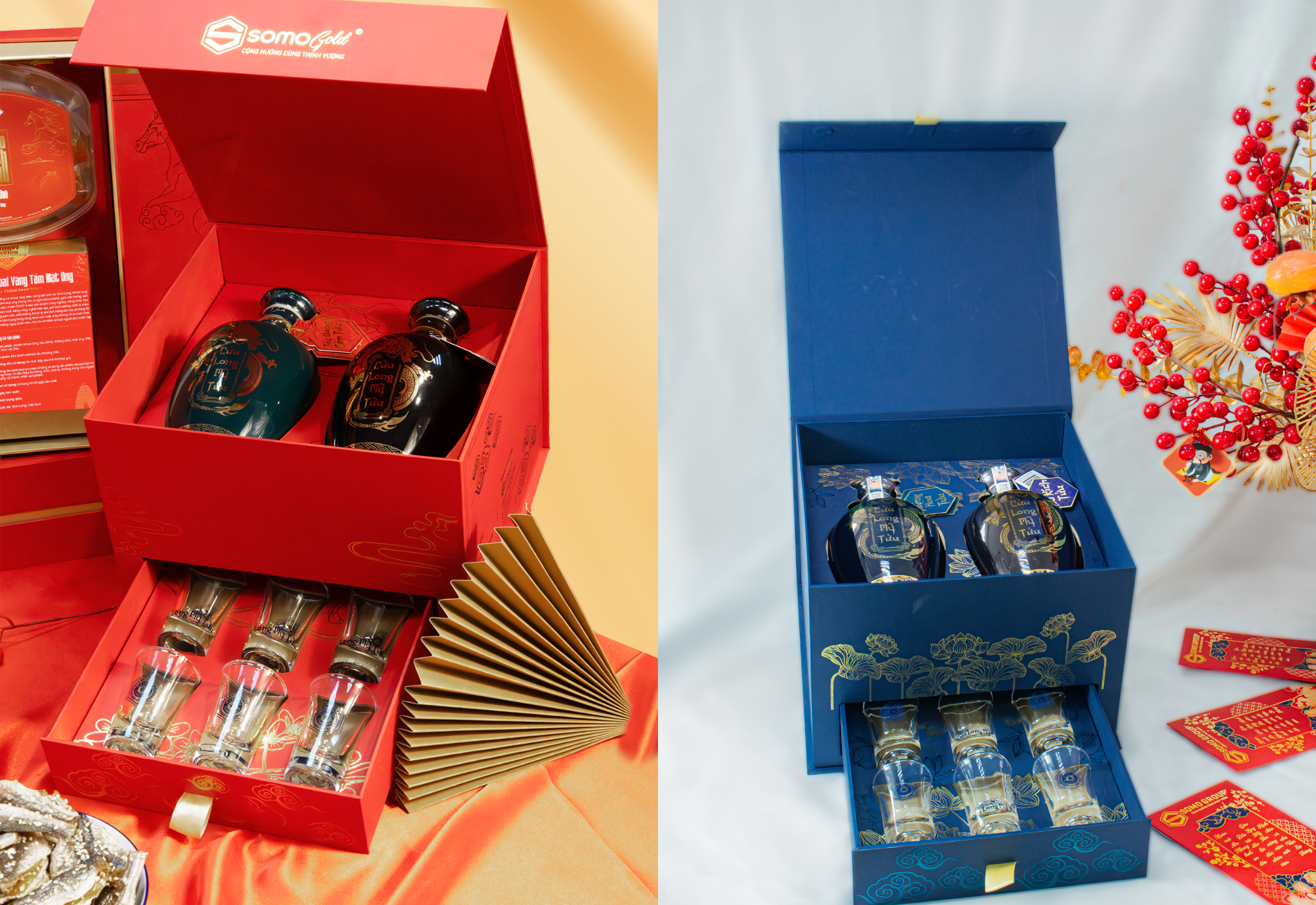 - 02 chai Rượu Cửu Long Mỹ Tửu: Dòng rượu nổi tiếng của Somo Gold, khách hàng có thể lựa chọn dòng mỹ tửu mà mình muốn có bên trong set quà để phù hợp với nhu cầu, sở thích của mình. Các dòng Cửu Long Mỹ Tửu bao gồm Hoàng Hoa Tửu, Minh Mạng Tửu, Tây Dương Sâm Tửu.